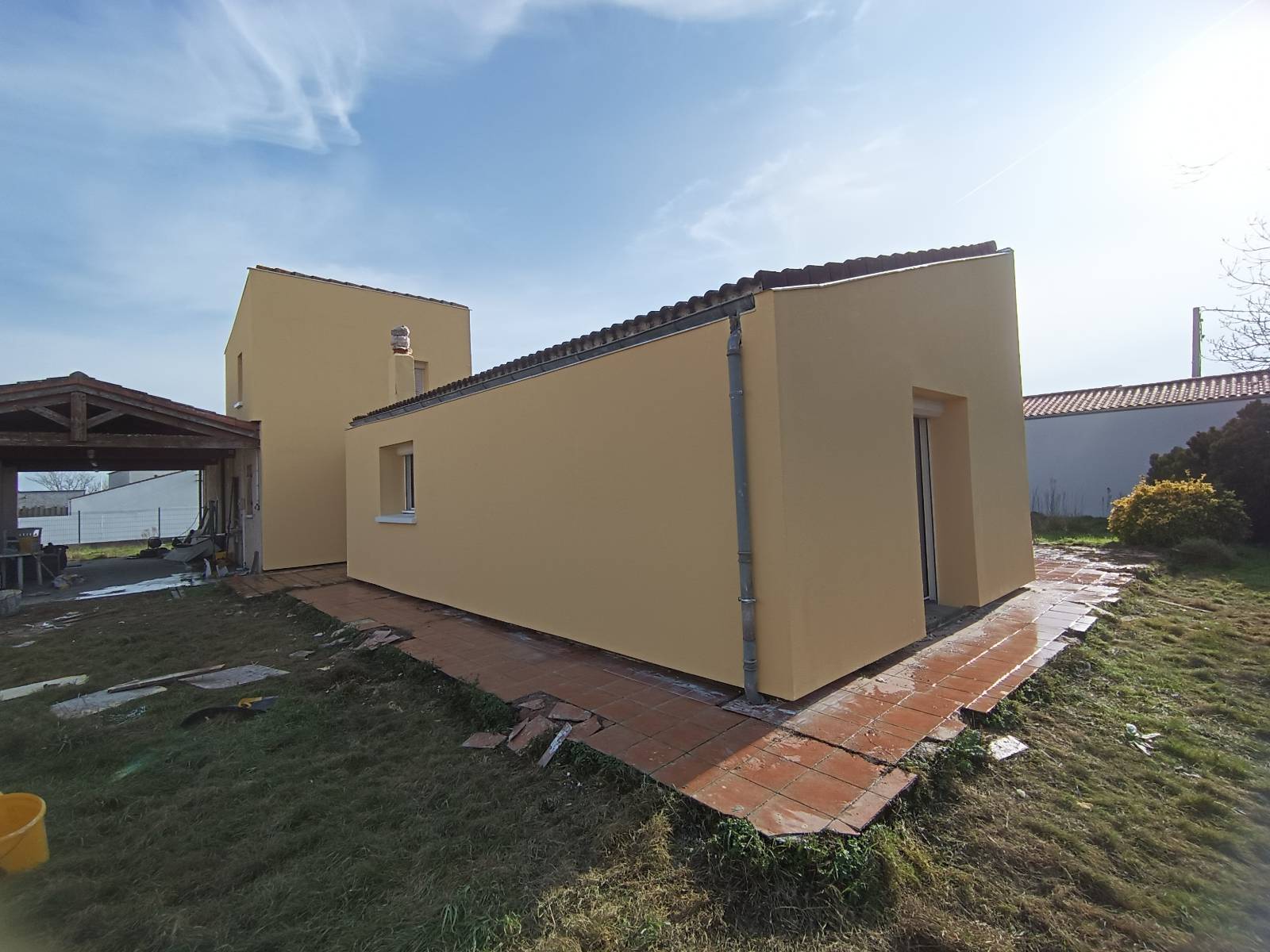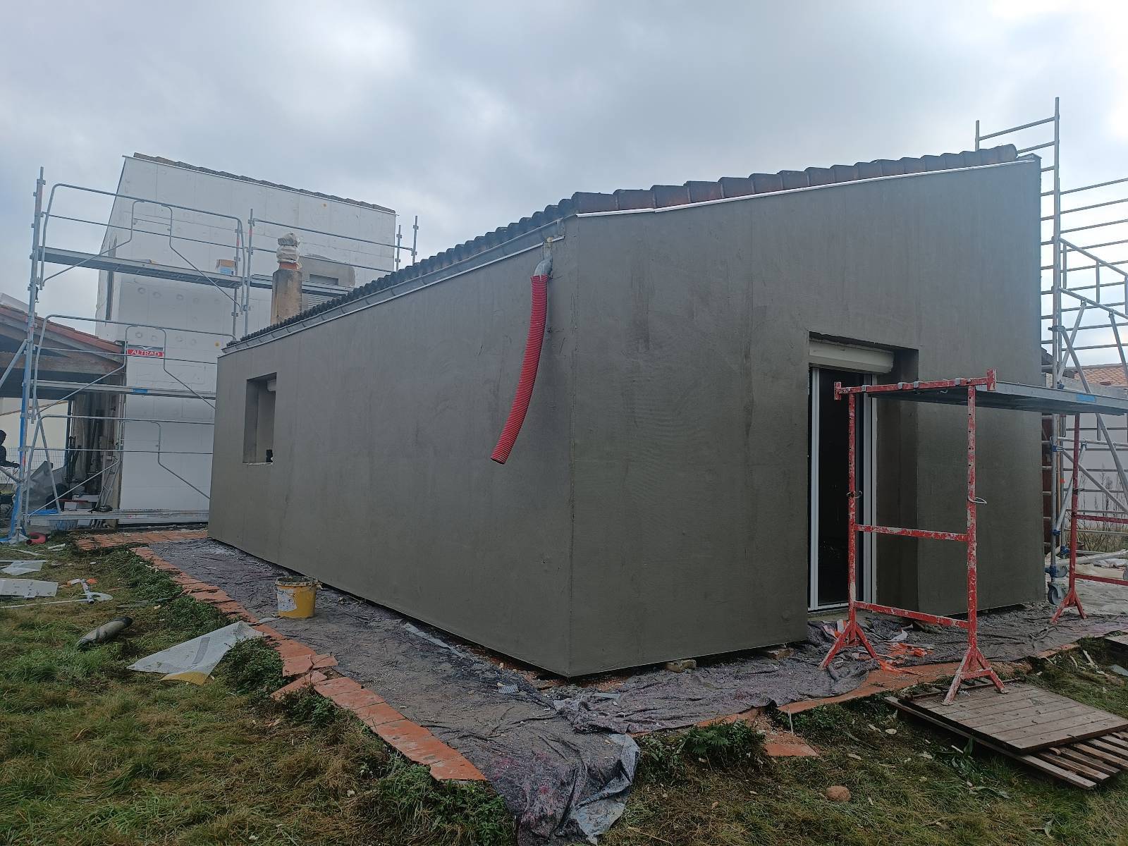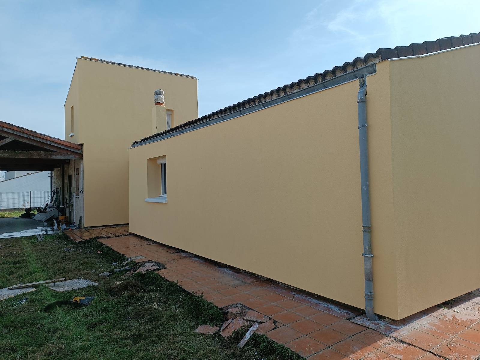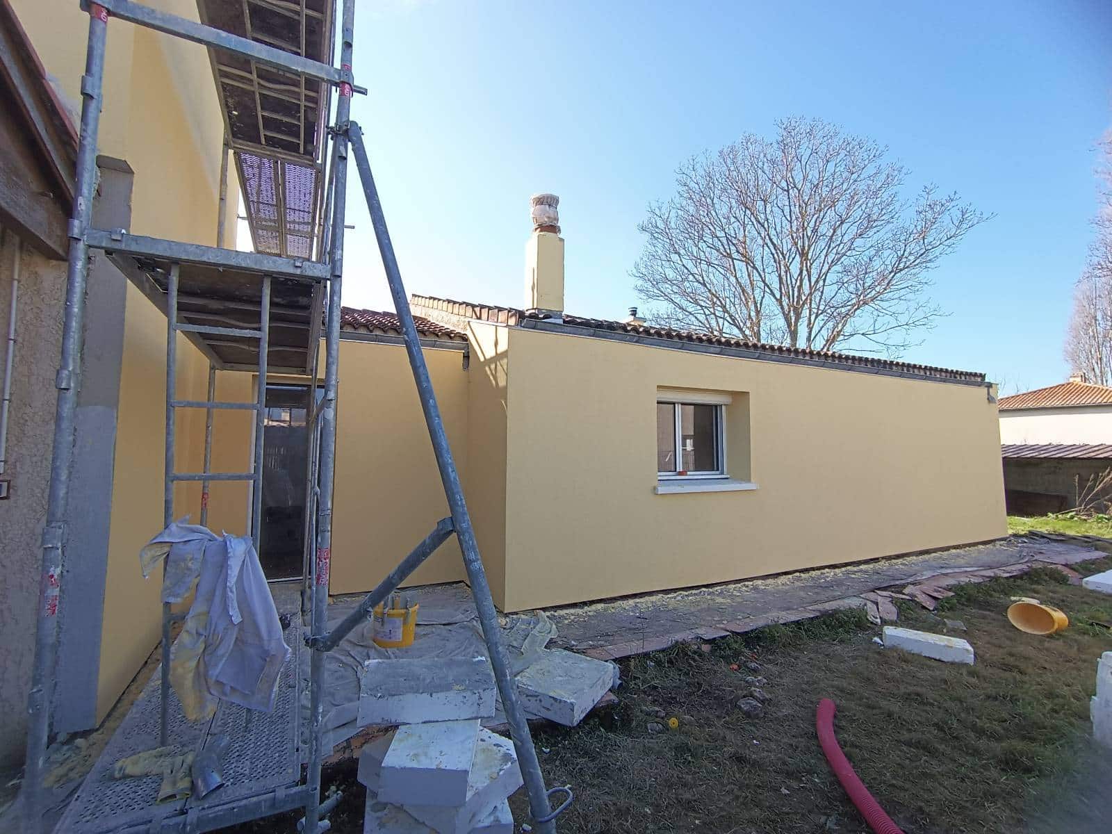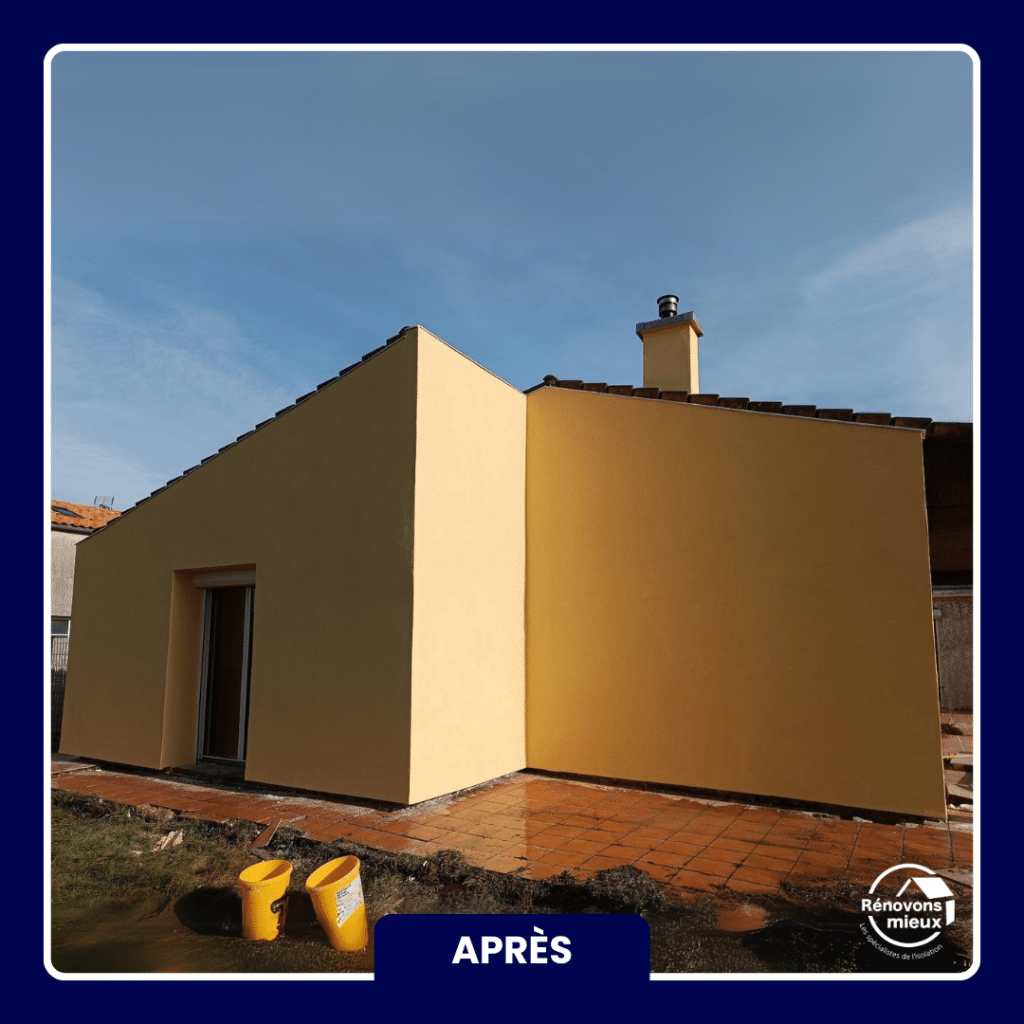 Le chantier a duré 10 jours, du montage de l’échafaudage jusqu’au démontage. Les façades sont désormais protégées et les parois intérieures gagnent en stabilité thermique. La finition est un enduit teinte curcuma et la réception s’est faite sans réserves.