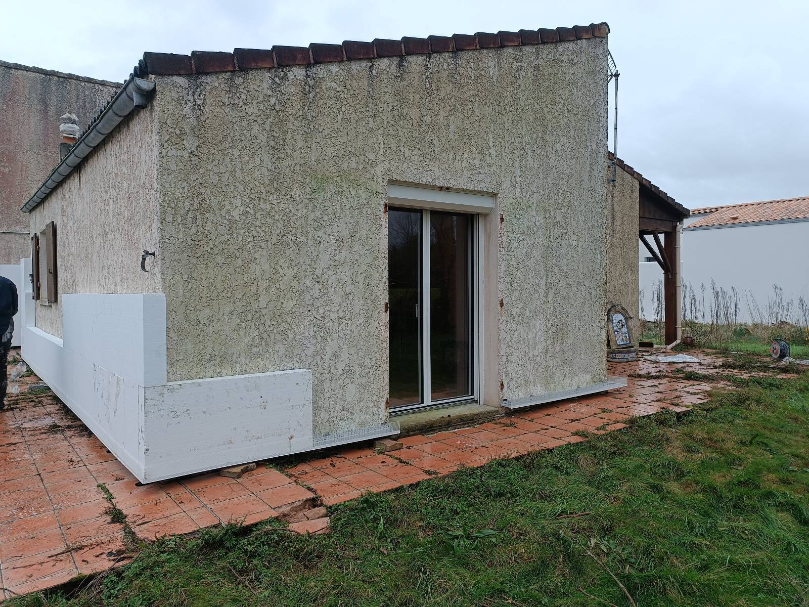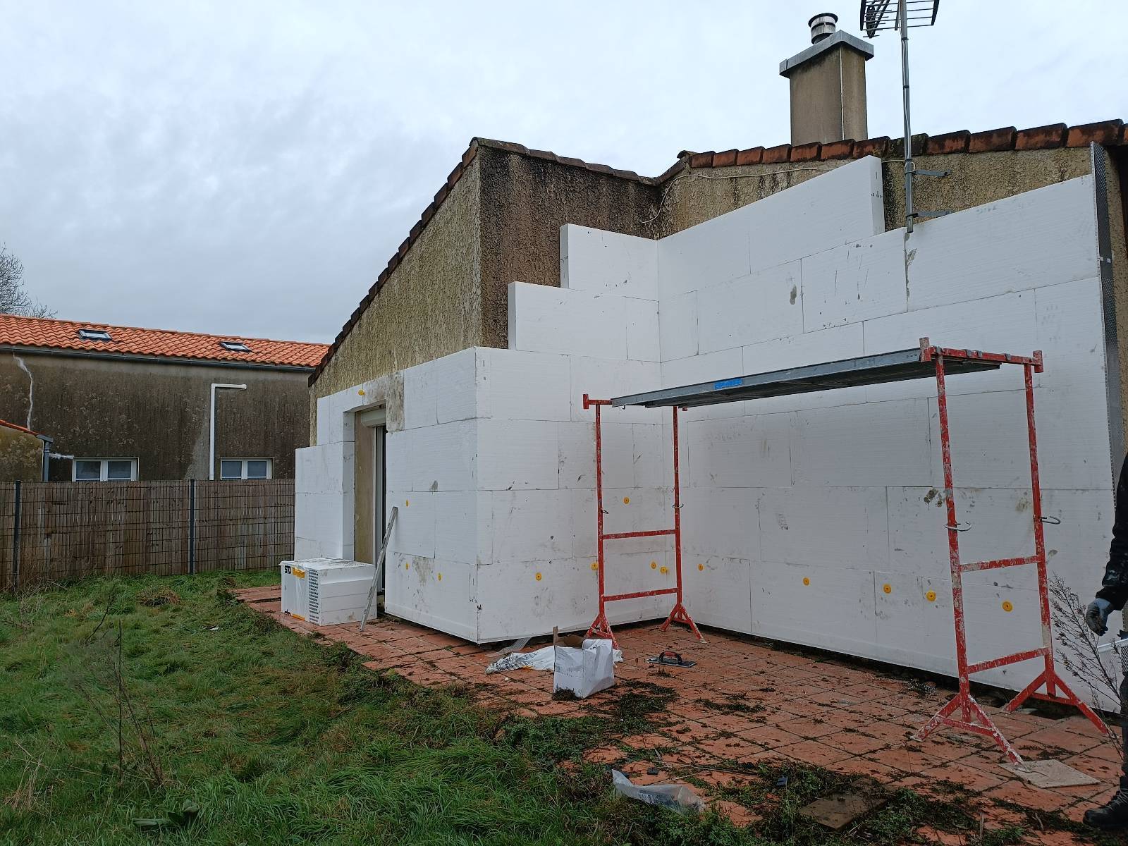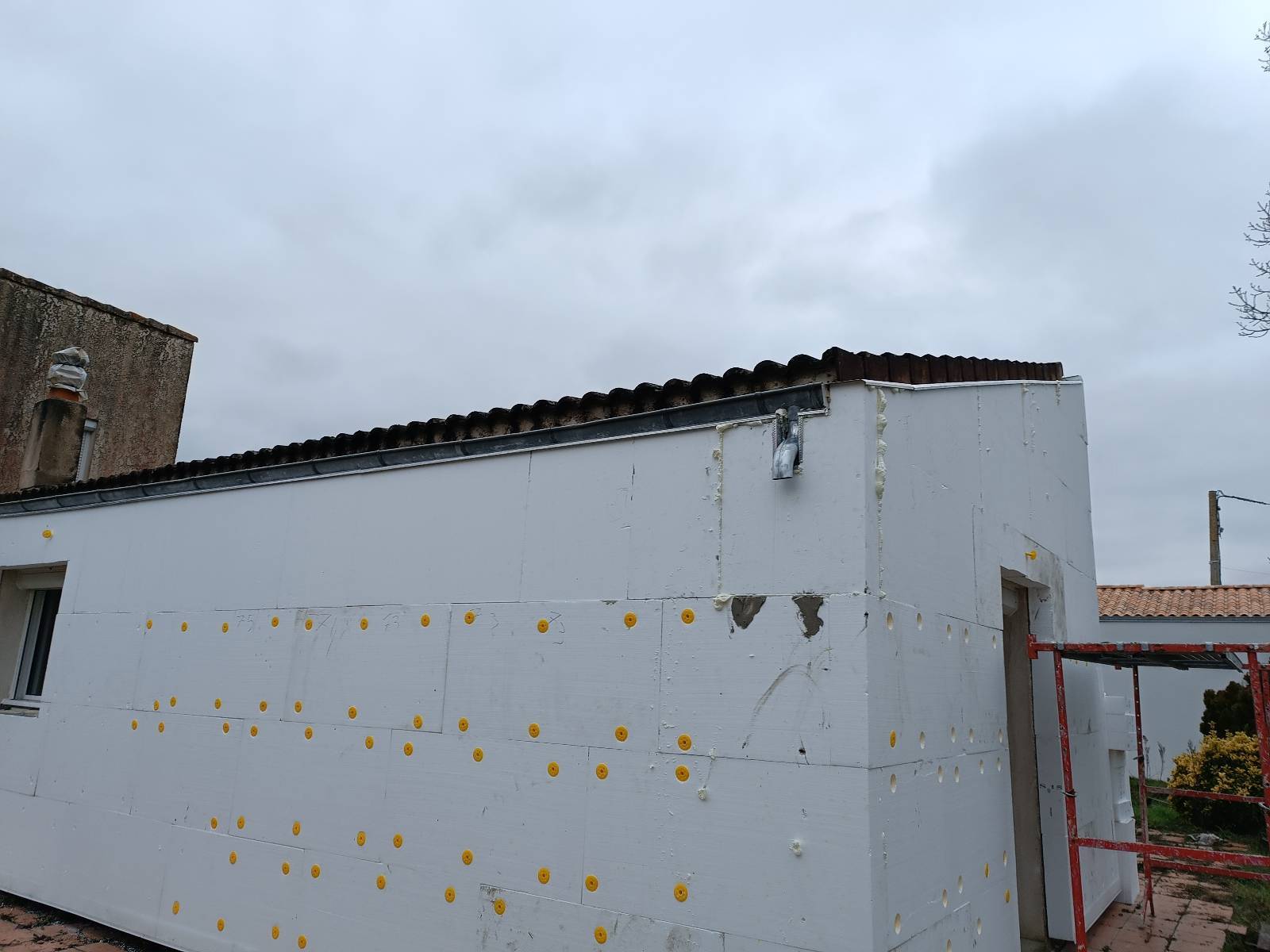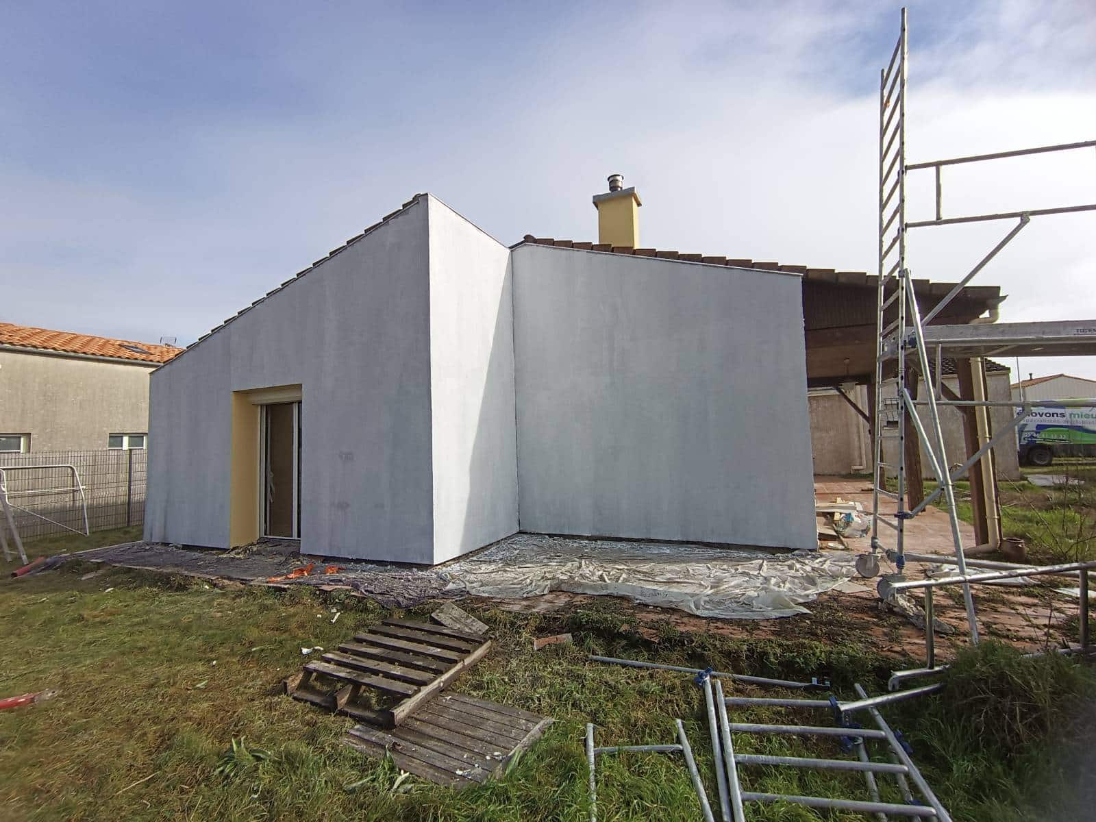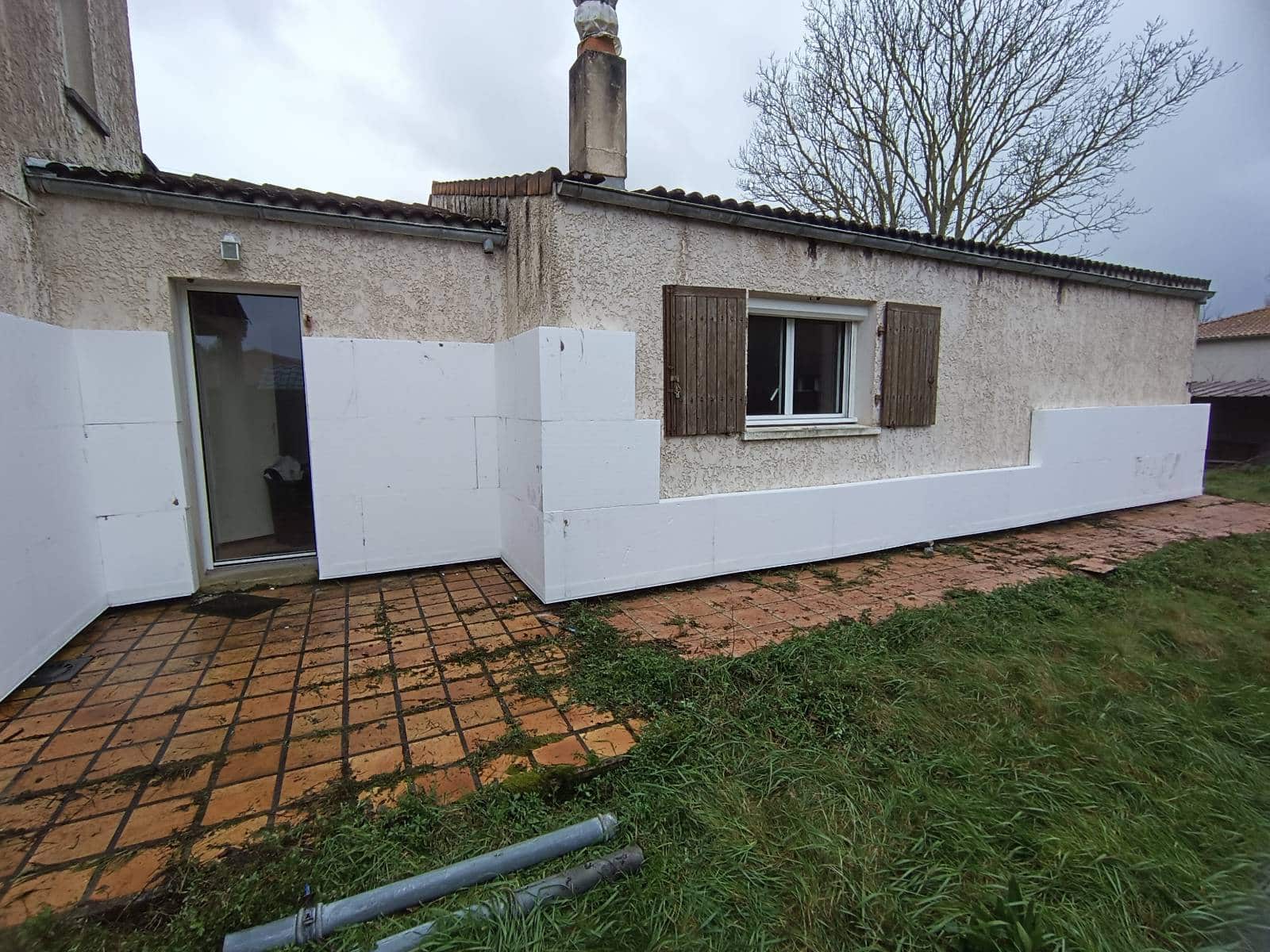 Sur cette maison à étage située à Yves (17340), près de Châtelaillon et de La Rochelle, nous avons isolé 100 m² de façades en polystyrène expansé Knauf. Un échafaudage complet a été monté pour travailler en sécurité tout autour de la maison. Les murs ont été préparés, puis les panneaux collés et chevillés avant la mise en place du sous-enduit armé et de la finition.