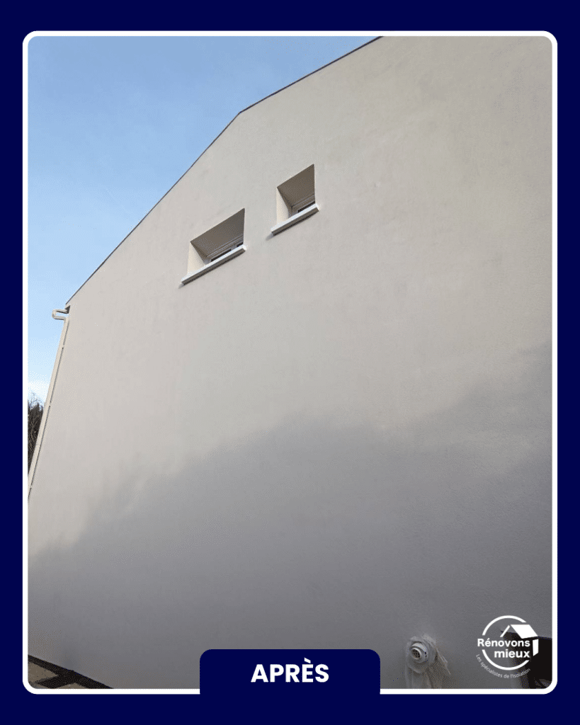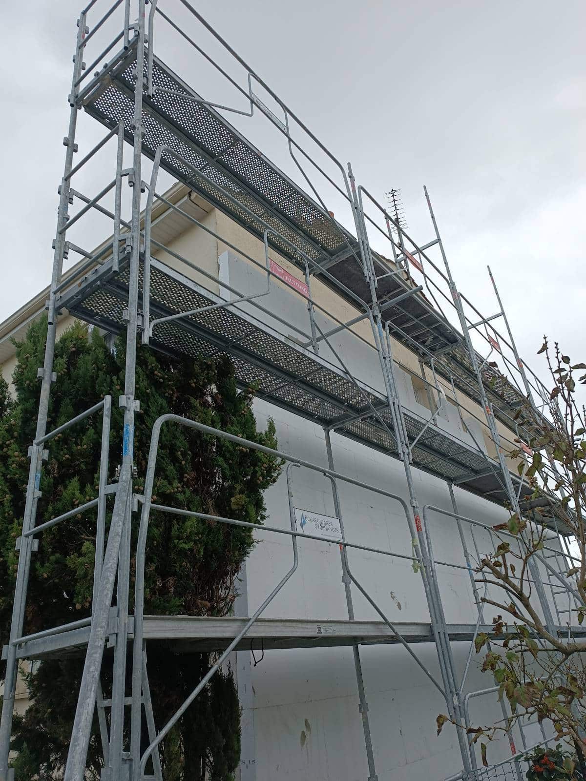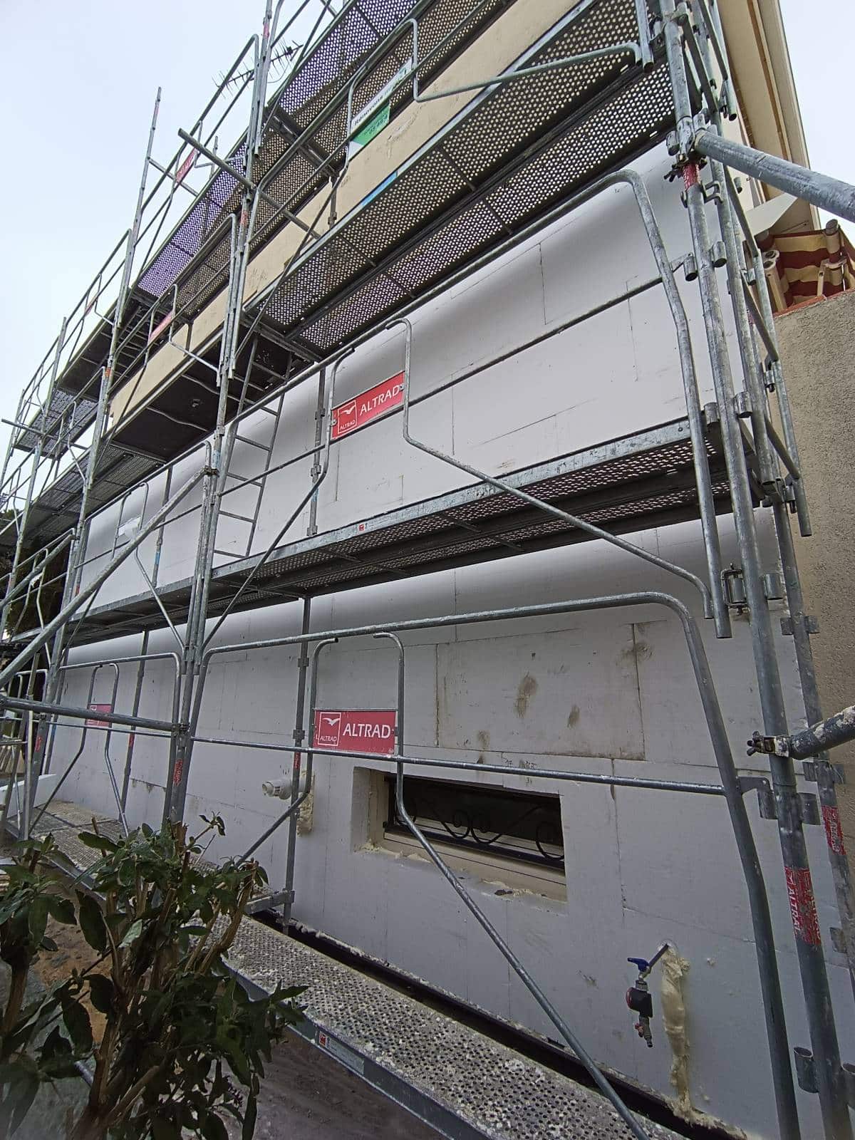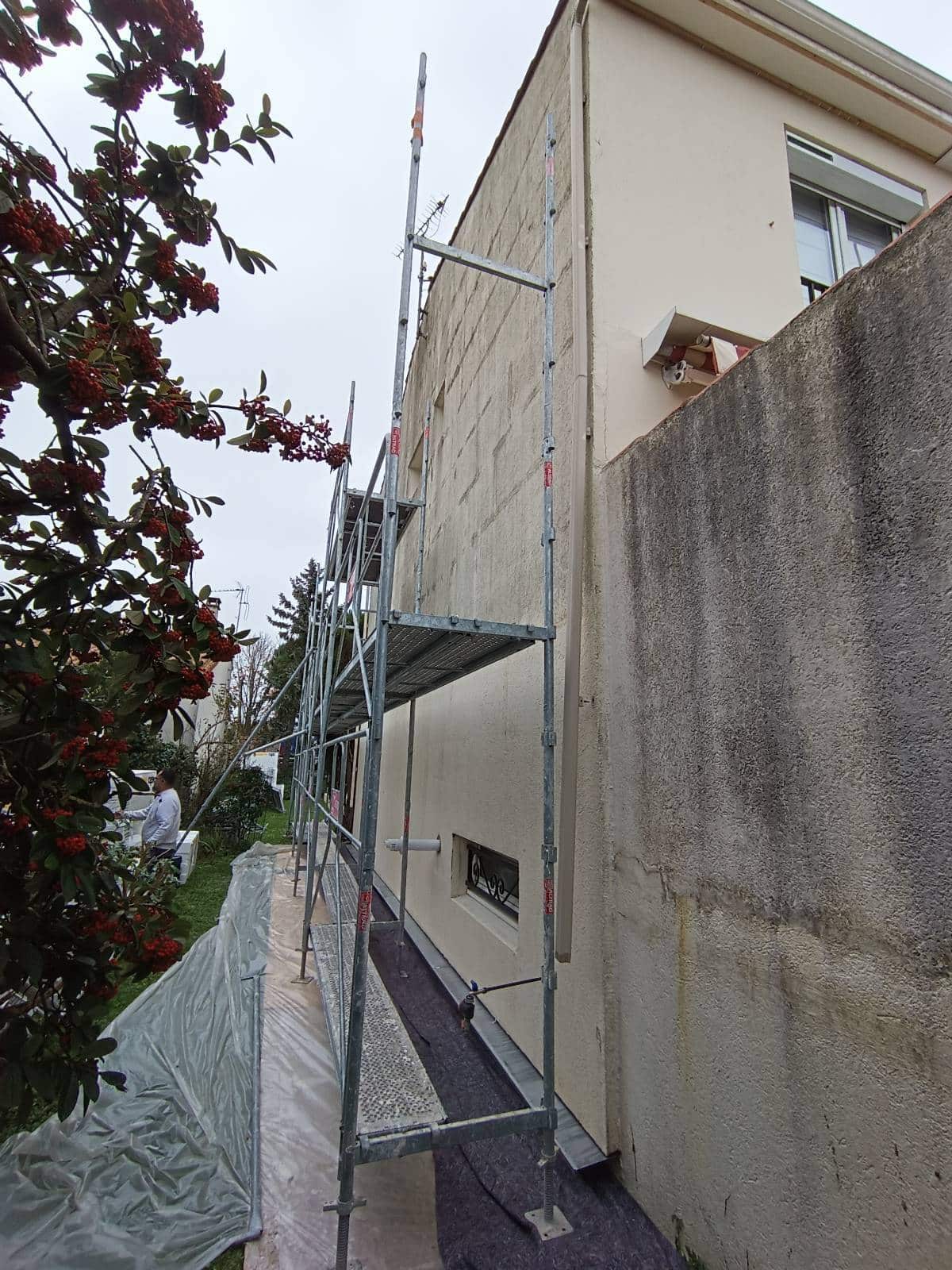 Sur cette maison à un étage située à La Rochelle (17000), nous avons isolé 82 m² de façades en huit jours. Après la pose de l’échafaudage, les murs ont été préparés puis recouverts de panneaux en polystyrène expansé Knauf, fixés et chevillés avant application du sous-enduit et de la finition. Les tableaux et les points singuliers ont été traités pour assurer une continuité de l’isolation.