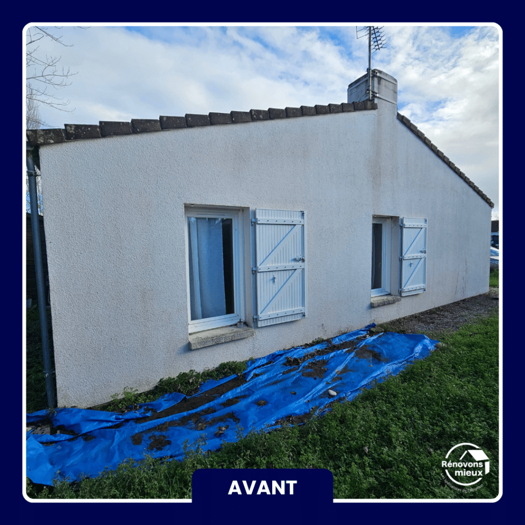 Sur cette maison de plain-pied à Coulon (79510), nous avons isolé 92 m² de murs par l’extérieur en neuf jours. Les façades étaient en bon état, ce qui a permis une pose directe d’un polystyrène graphité, choisi pour sa performance thermique avec une épaisseur maîtrisée sous les débords de toit.